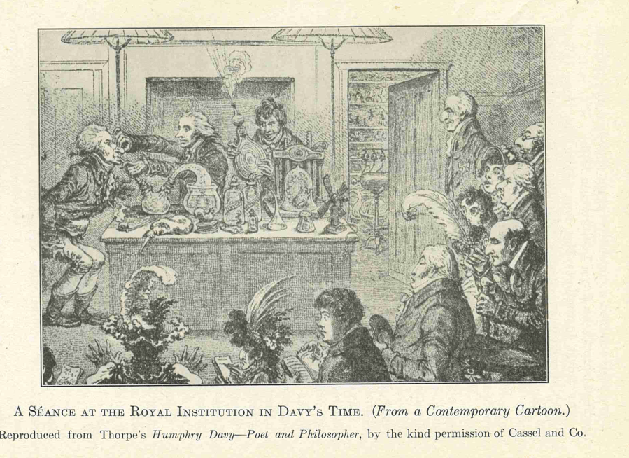 Shunned as an anesthetic, the euphoric properties of nitrous oxide made it a popular party drug, sometimes administered in traveling entertainment tents bearing Davy’s picture. Davy called nitrous oxide inhalation “pleasurably thrilling.”Others have described it as “you’re all rubbery and relaxed and silly laughing usually. The rooms can seem to be collapsing and spinning but in a fun way with sort of swooshing wavy sounds.” The nitrous oxide promotion propelled Davy into fame–it was a fad that won him a prestigious appointment to the Royal Institution in 1801 at the young age of 22. In this capacity, he lectured and popularized science to the point that he was knighted at the age of 34 and later made a baronet.Davy also discovered ether and chloroform. Although he did help his assistant Michael Faraday achieve fame, Davy clung to his superiority as if he had been born into it.