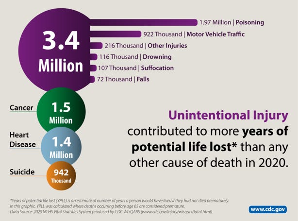 The top causes of death in the US in order are heart disease, cancer, covid, and accidents. Of the accidents, accidental poisoning is the most common type of accident. You might think of prescription drugs at this point but carbon monoxide is a big source of poison. Alcohol is the top killer by poison. Motor vehicle accidents are the second cause of accidental deaths.