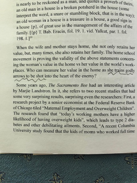 Note that he really strays from the passages, supporting homeschooling (unpaid labor by the woman basically), and declaring other people enemies to be shot down by weaponized kids.