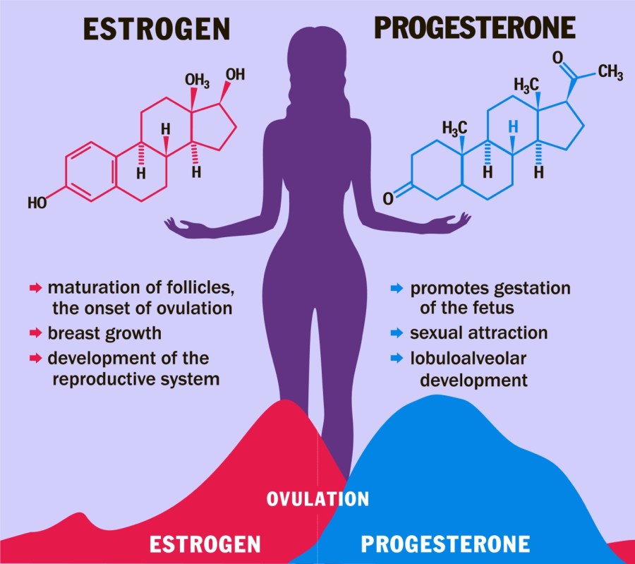 Once a female matures, she’s under the rhythmic sway of two hormones—estrogen and progesterone. Estrogen dominates the first half of the menstrual cycle, promoting growth of the endometrial layer in the uterus and making a nest so to speak. Estrogen gives us our secondary sex characteristics such as breasts. It protects our bones and keeps cholesterol in check. It can sometimes encourage cancer, too.